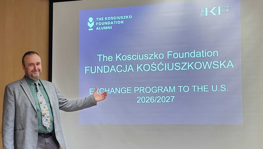 On October 21st, 2025, in lecturing hall of the university’s library in Zielona Góra, T. Mróz delivered a talk about the history of the Kosciuszko Foundation and exchange programs for Polish scholars to pursue research visits in American academic institutions. The talk was based on the presentation provided by The Kosciuszko Foundation Alumni, but its basic aim was to encourage prospective grantees to submit their project proposals and spend a couple of months in American universities. Moreover, Mróz shared his experience of preparing his proposal, of the interview and of many practical details of his 5 months research stay at the University of Iowa. The audience at the meeting was not numerous, yet highly motivated to develop their academic careers with support of the Foundation. A brief report from the meeting was published on the website of the University of Zielona Góra and on social media of the The Kosciuszko Foundation Alumni.
